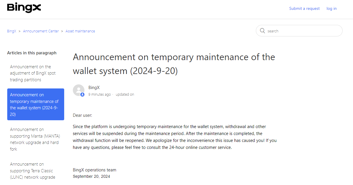 此前其于今晨宣布正在进行钱包系统临时维护,BingX官方表示,由于系统维护,用户提现到账时间可能会出现延迟。预计相关服务将在24小时内逐步恢复正常。