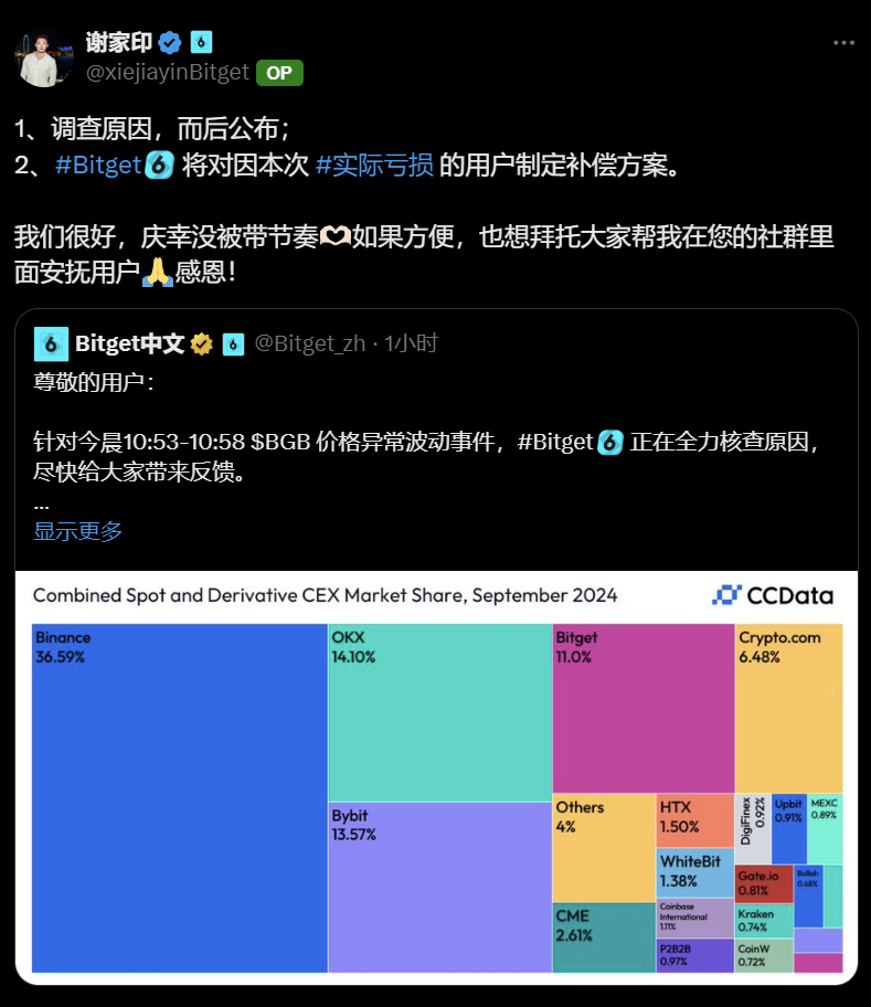 深潮 TechFlow 消息,10 月 7 日,Bitget 中文官方发文表示,针对上午 10 时 53 分至 10 时 58 分期间 Bitget 平台代币 BGB 价格异常波动事件,Bitget 正全力核查原因,并将尽快向用户反馈调查结果。Bitget 华语负责人谢家印表示,将为因此次事件遭受实际损失的用户制定补偿方案。