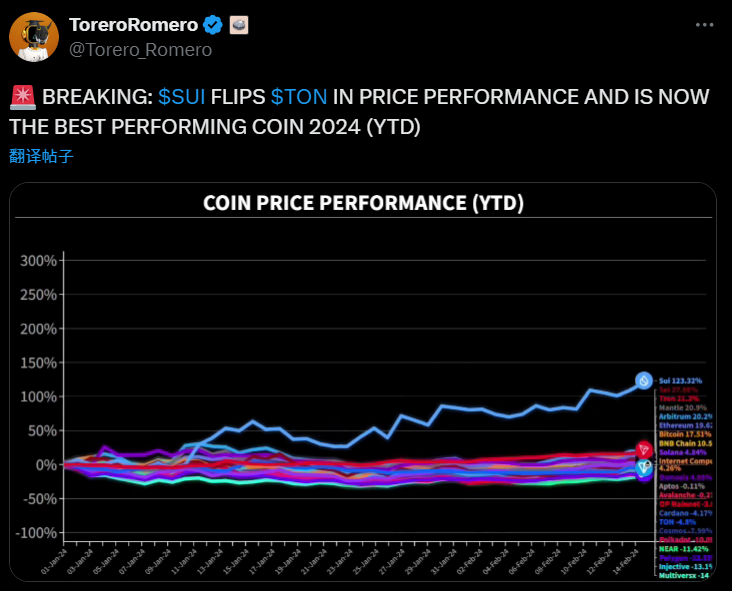 SUI 超越 TON,成为 2024 年初至今价格表现最佳的公链代币