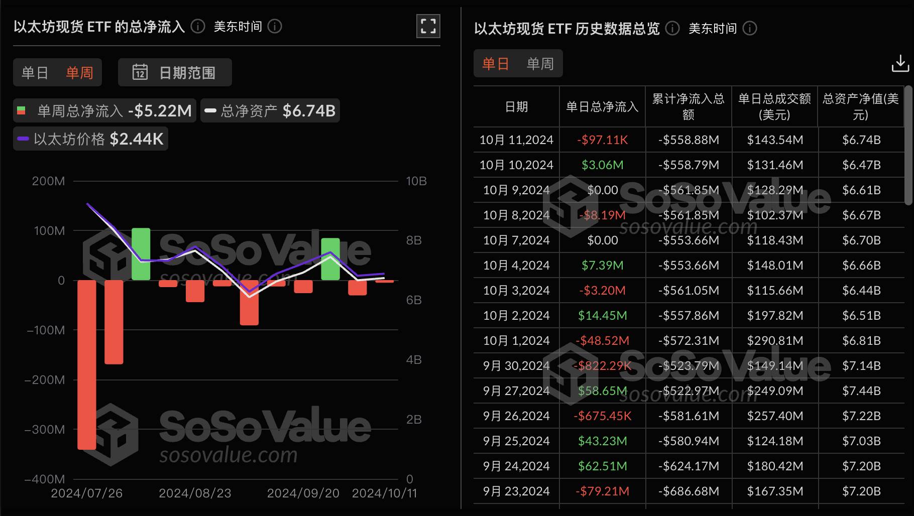 截止发稿前,以太坊现货 ETF 总资产净值为 67.35 亿美元,ETF 净资产比率(市值较以太坊总市值占比)达 2.28%,历史累计净流出已达 5.59 亿美元。