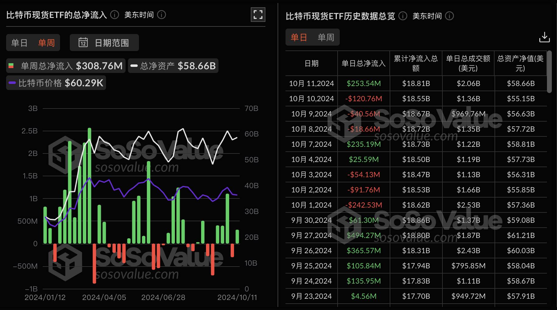 深潮 TechFlow 消息,根据 SoSoValue 数据,上周交易日(美东时间  10 月 07 日至 10 月 11 日)比特币现货 ETF 上周单周净流入 3.08 亿美金。
