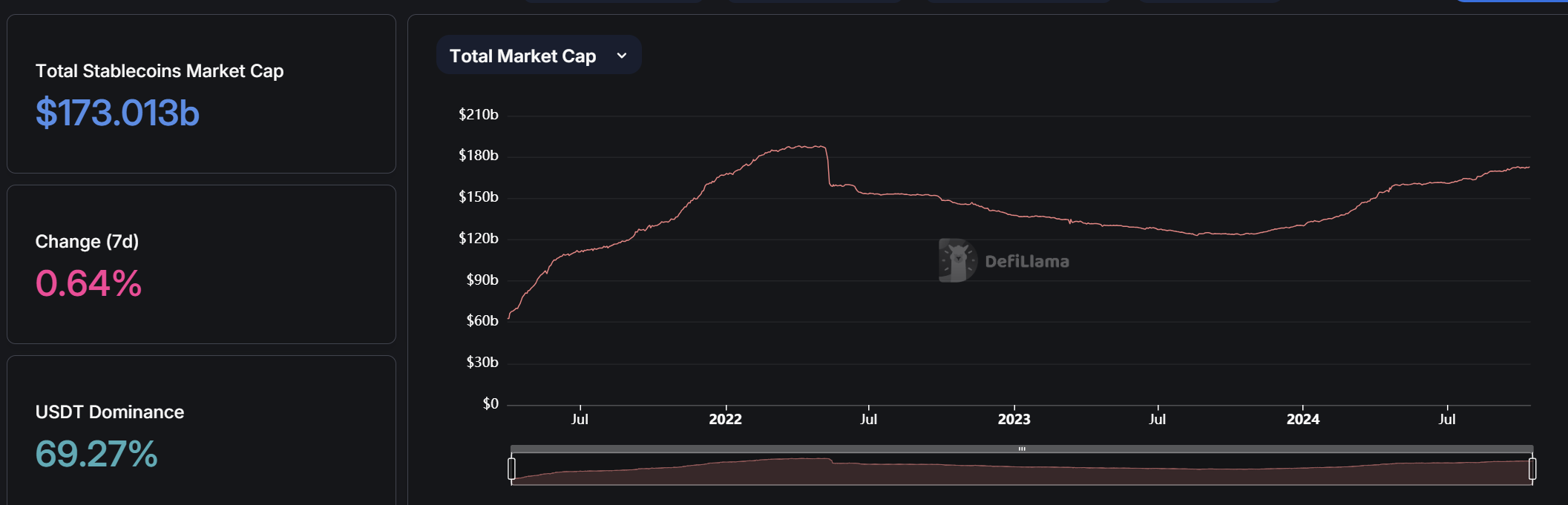 深潮 TechFlow 消息,10 月 14 日,据 DefiLlama 数据显示,稳定币总市值现报 1730.13 亿美元,续创自 2022 年 5 月以来新高,7 日增幅达 0.64%。其中 USDT 占比达 69.27%。