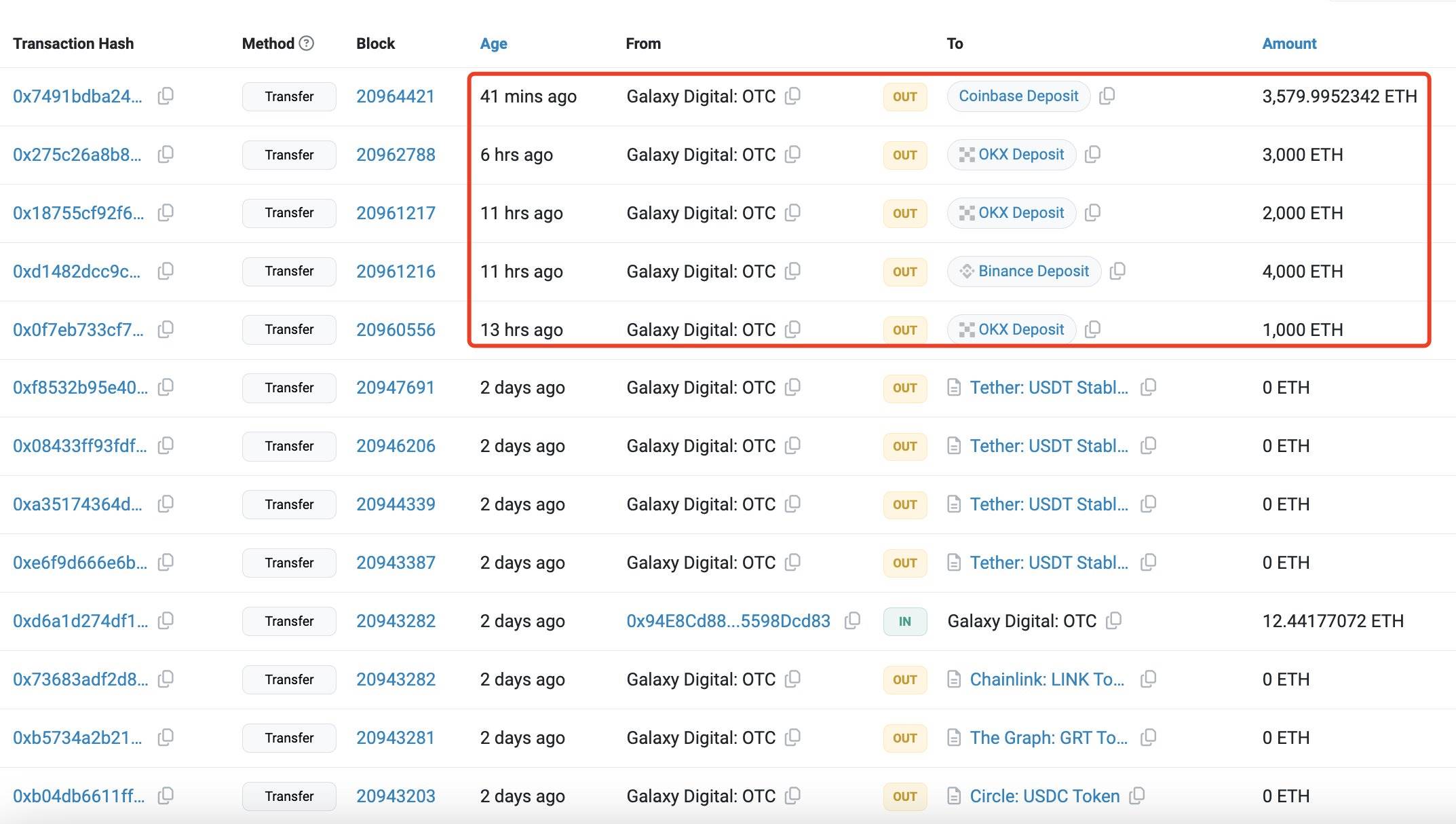 Galaxy Digital OTC 钱包过去 14 小时内向 CEX 转入 13,580 枚 ETH,价值约 3430 万美元