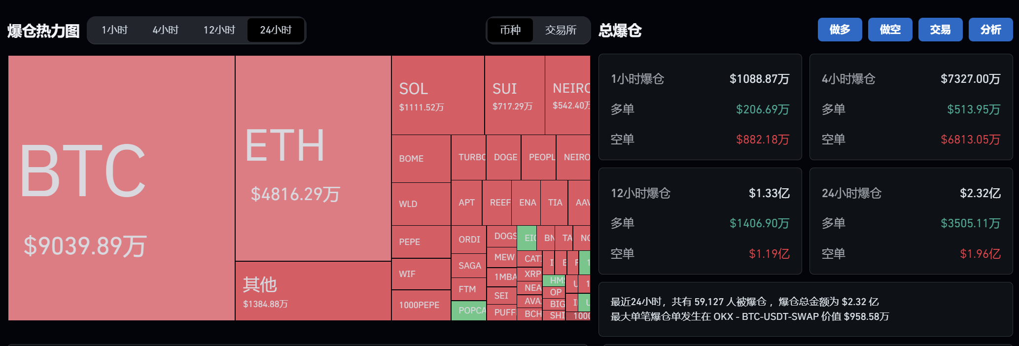 过去 24 小时全网爆仓 2.32 亿美元,主爆空单