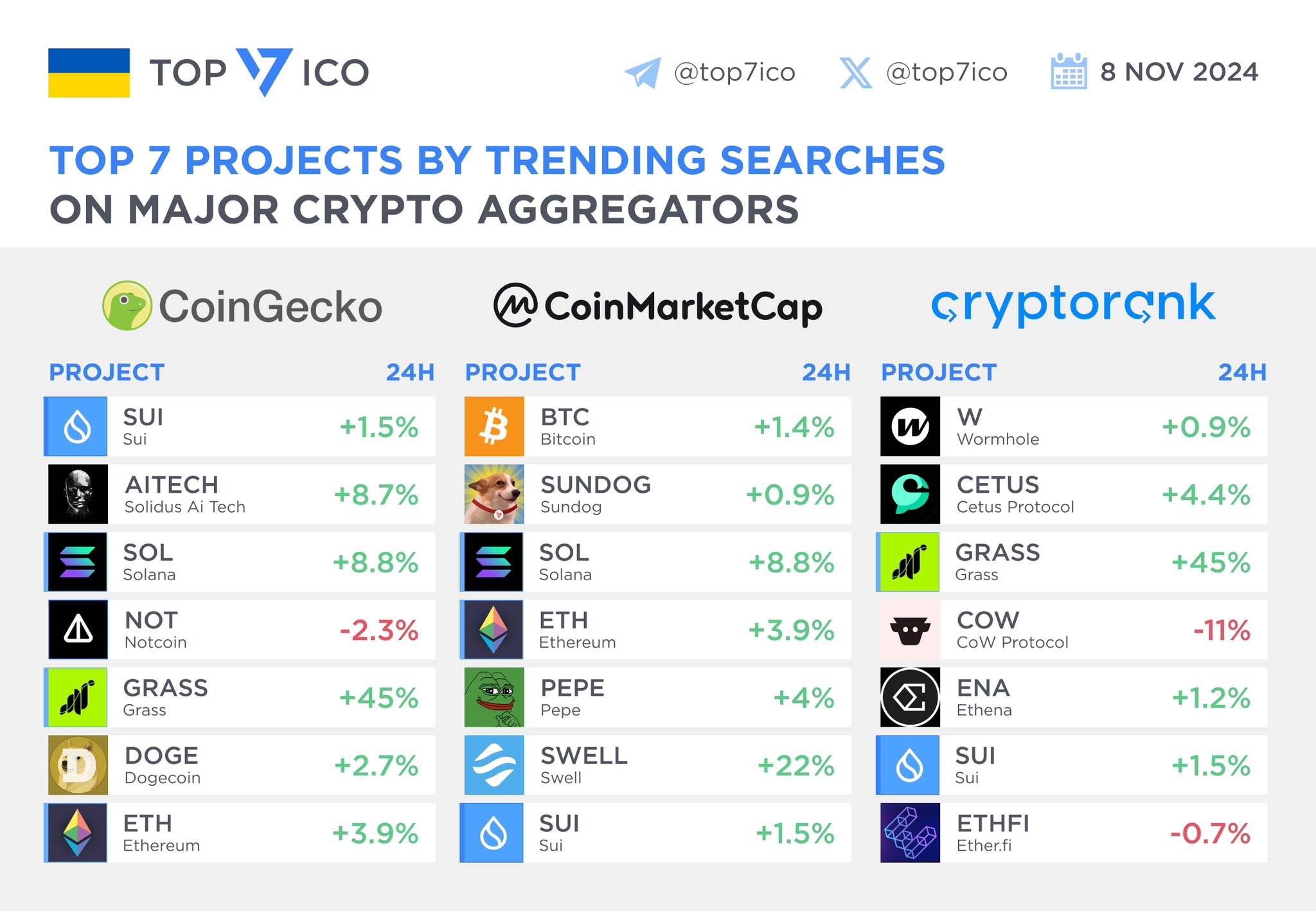 深潮 TechFlow 消息,11 月 8 日,据 TOP 7 ICO 数据,GRASS、SOL 和 SUI 在 CoinGecko、CoinMarketCap 和 CryptoRank 三大加密货币聚合器上受关注度最高。其中,GRASS 24 小时涨幅高达 45%,SOL 24 小时涨 8.8%,SUI 24 小时涨 1.5%。