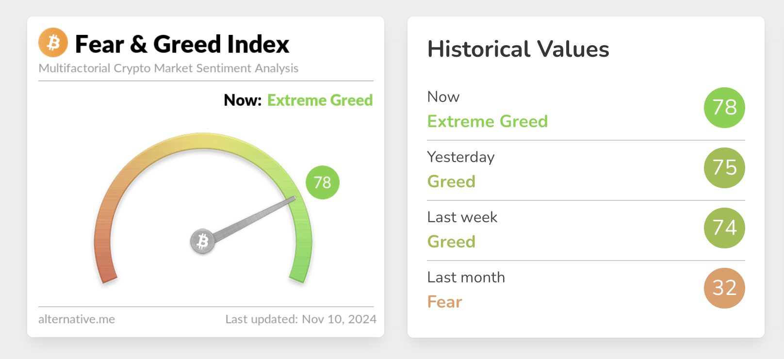 今日恐慌与贪婪指数为 78,等级由贪婪转为极度贪婪