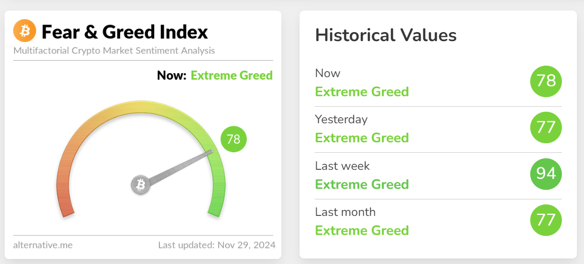 深潮 TechFlow 消息,11 月 29 日,据 Alternative 监测,今日恐慌与贪婪指数升至 78(昨日为 77),等级仍为极度贪婪。