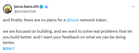 Base 协议主管:Base 无发币计划,团队将专注产品建设