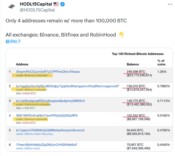 深潮 TechFlow 消息,12 月 4 日,据HODL15Capital数据显示,目前仅剩 4 个比特币地址持有超过 10 万枚BTC。这些地址均分别来自币安、Bitfinex和Robinhood。