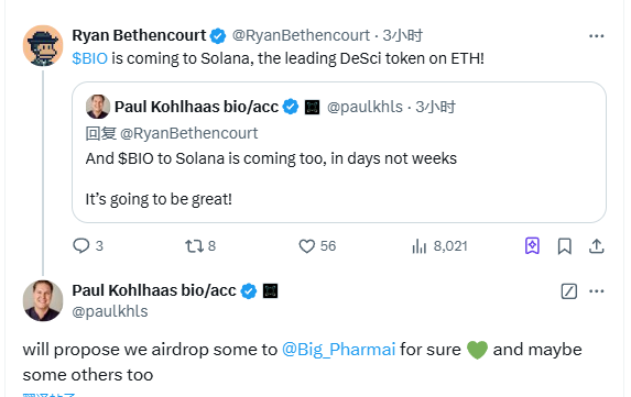 BIO Protocol联创:BIO代币将上线Solana,将提议向Big Pharmai等社区空投
