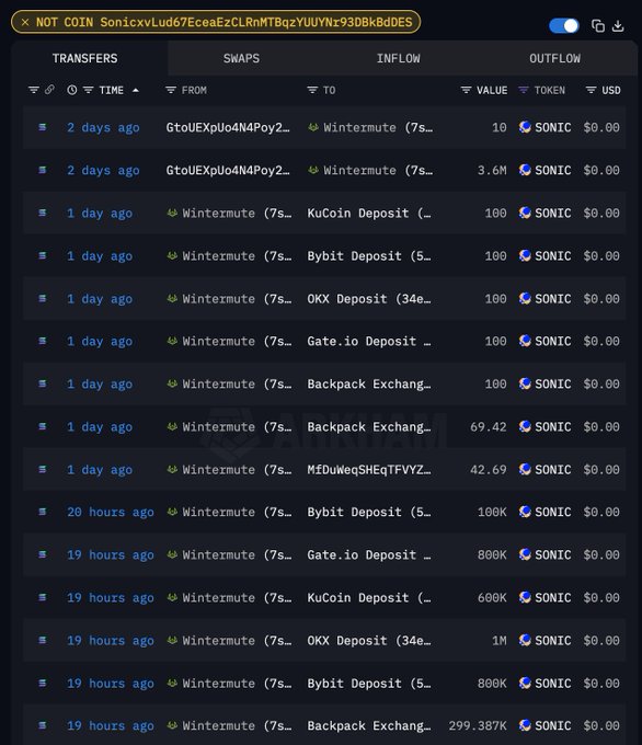 Wintermute 为 SONIC 做市商之一,于 2 天前收到项目方分发的 360 万枚 SONIC