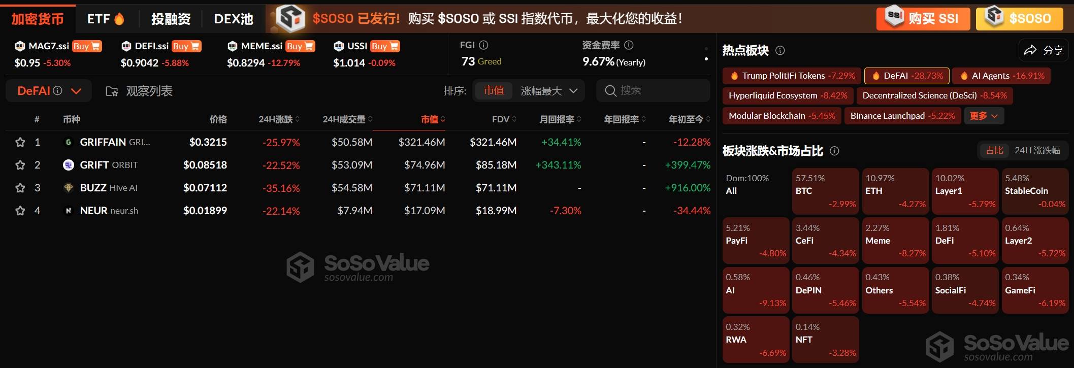 深潮 TechFlow 消息,1月27日,根据 SoSoValue 数据,加密市场板块全部回调,DeFAI 及AI Agents 板块下跌幅度最大。DeFAI 板块24小时跌幅达到28.73%,板块内四个代币均跌超20%,GRIFFAIN、ORBIT(GRIFT)、Hive AI(BUZZ)、neur.sh(NEUR) 分别跌25.97%、22.52%、35.61%、22.14%。AI Agents 板块24小时跌幅为16.91%,头部项目Virtuals Protocol(VIRTUAL)下跌12.74%,Fartcoin(FARTCOIN) 下跌22.11%,AI主流代币ai16z (AI16Z)、AIXBT、AI Rig Complex (ARC)分别下跌13.70%、13.22%、27.61%,但ACT逆势上涨2.42%。