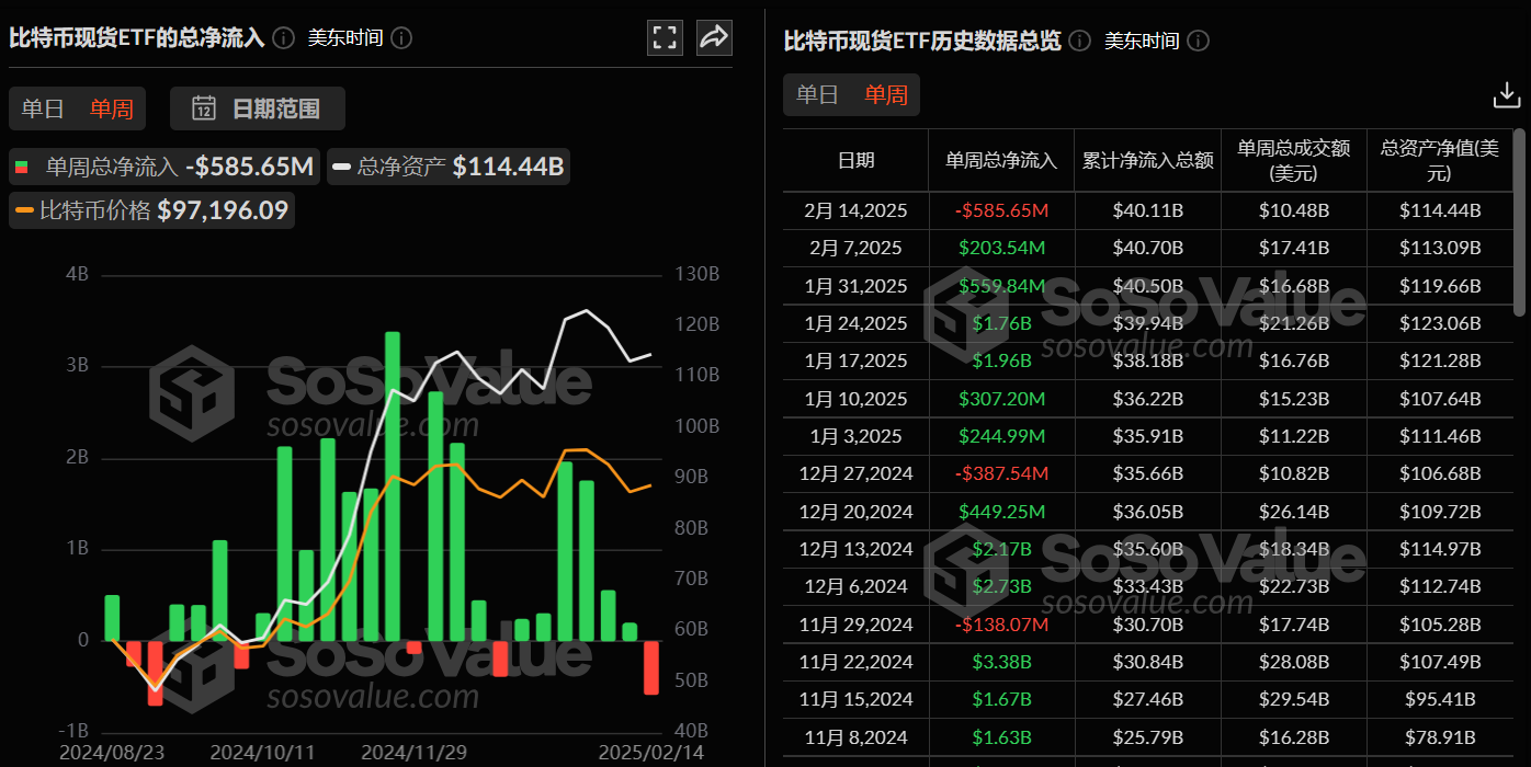 深潮 TechFlow 消息,据 SoSoValue 数据,上周交易日(美东时间 2 月 10 日至 2 月 14 日)比特币现货 ETF 上周单周净流出 5.86 亿美金。