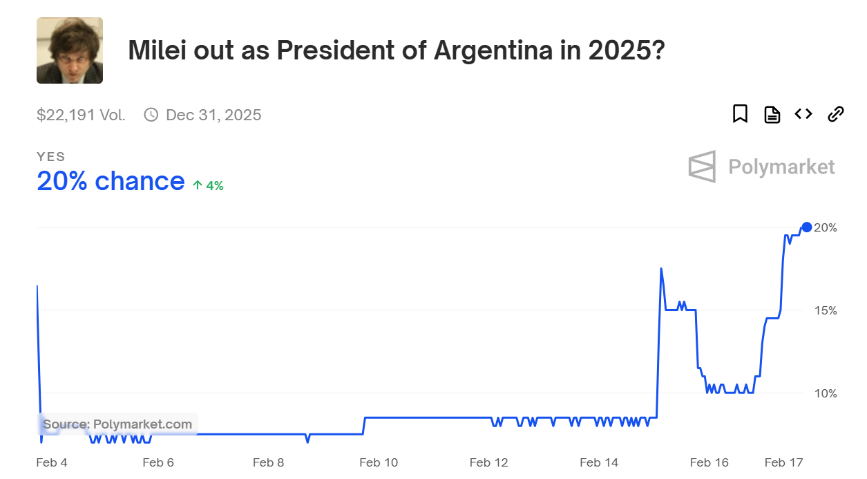 Polymarket 上预测阿根廷总统米莱今年离职的概率升至 20%