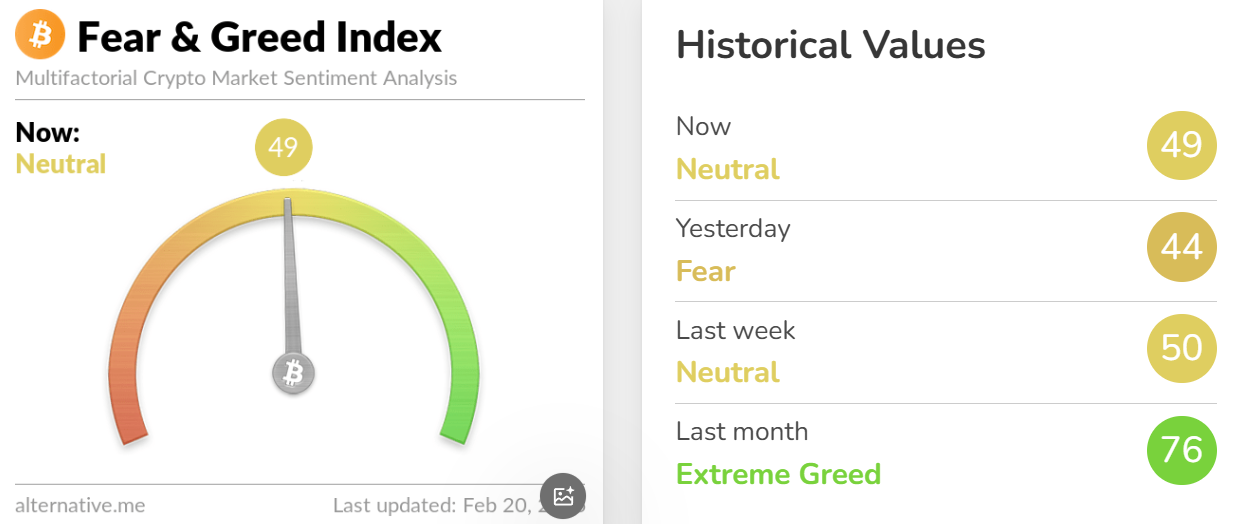深潮 TechFlow 消息,2 月 20 日,据 Alternative.me 数据,今日加密货币恐慌与贪婪指数升至 49(昨日该指数为 44),表明市场处于「中性状态」。
