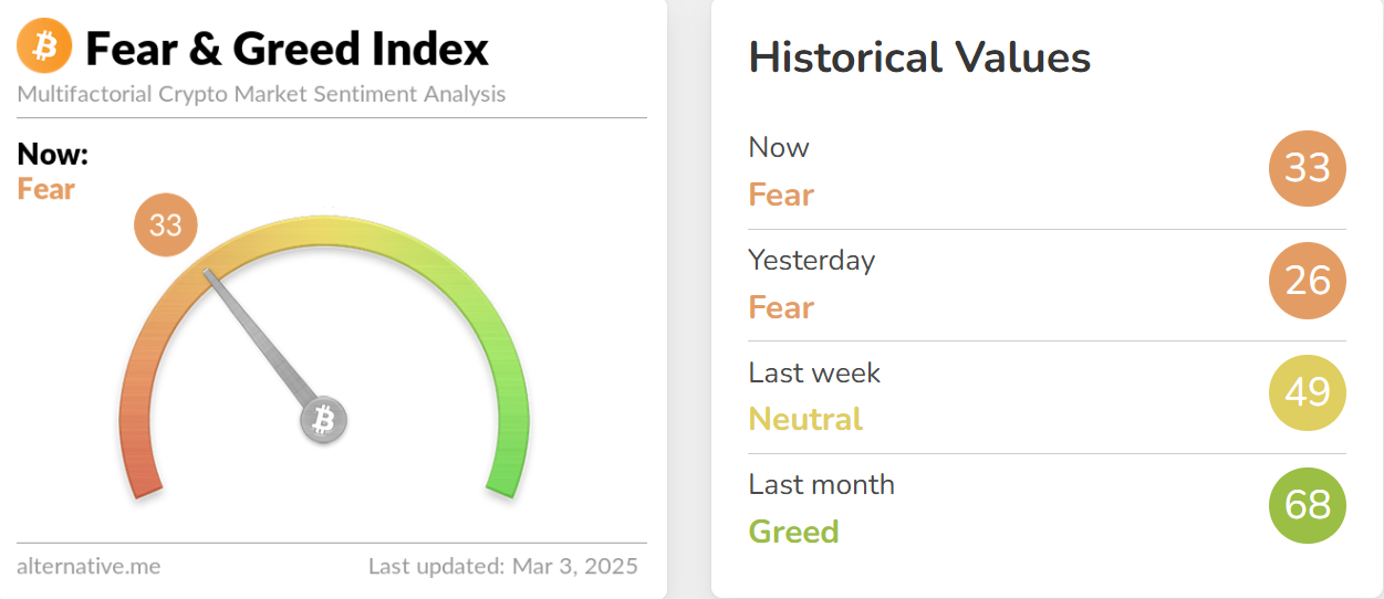 深潮 TechFlow 消息,3 月 3 日,据 Alternative.me 数据,今日加密货币恐慌与贪婪指数升至 33(昨日该指数为 26),表明市场仍处于「恐慌」状态。