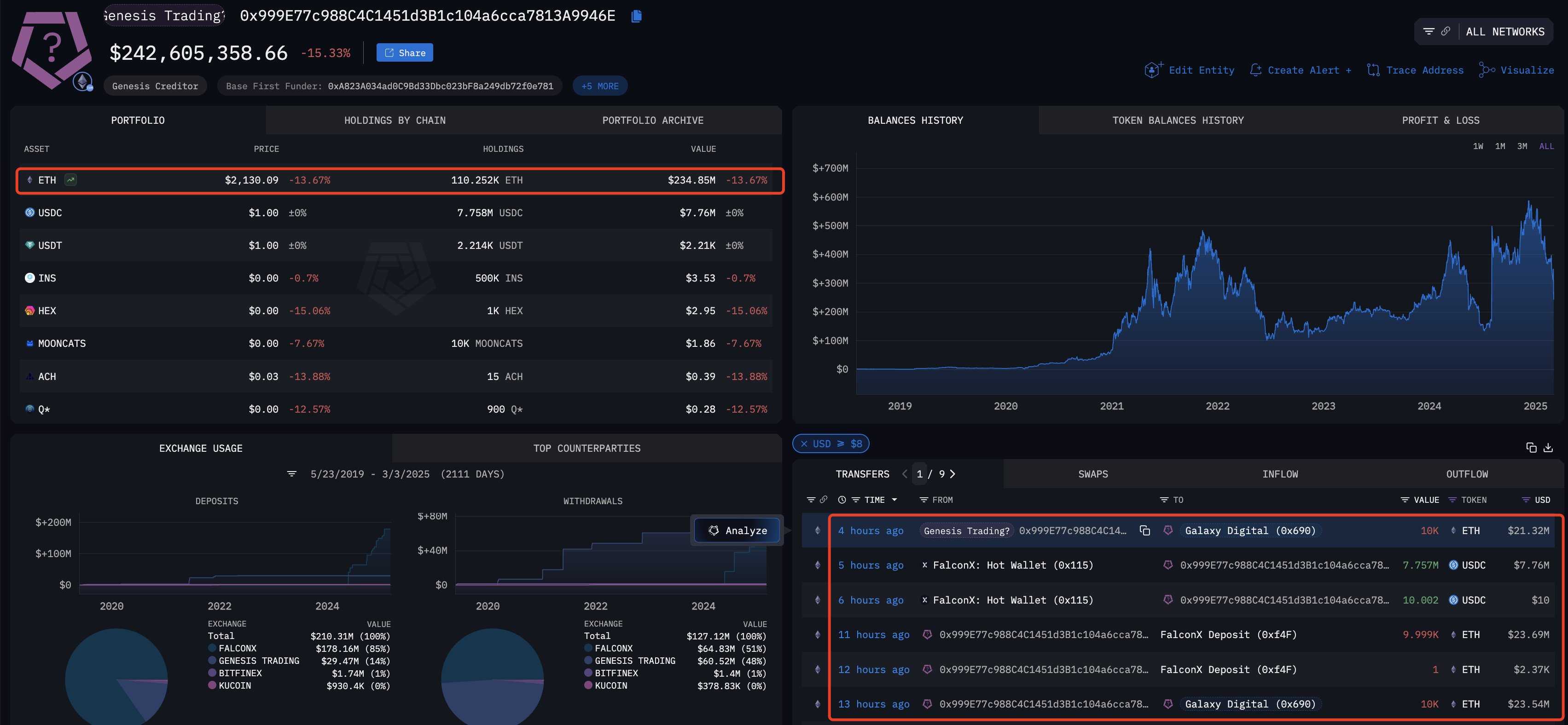 过去 14 小时内,该钱包已向 FalconX 和 Galaxy Digital 转移了 3 万枚 ETH(约 6855 万美元),并从 FalconX 收到了 776 万 USDC。该钱包可能与 Genesis Trading 有关。