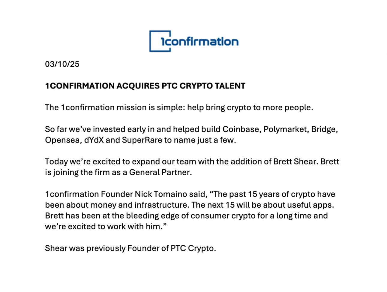 深潮 TechFlow 消息,据官方公告,加密风险投资机构 1confirmation 已收购 PTC Crypto,并任命其创始人 Brett Shear 为普通合伙人。