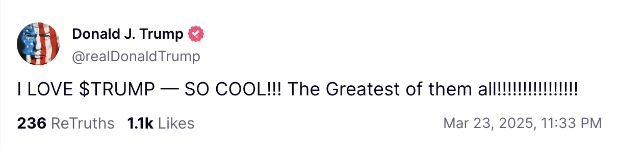 深潮 TechFlow 消息,3 月 23 日,特朗普在社交媒体 Truth Social 上发文:我爱$TRUMP,非常酷,伟大的团队。