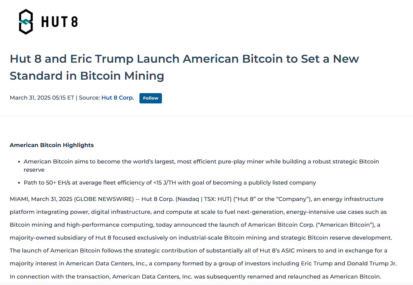 深潮 TechFlow 消息,3 月 31 日,据官方新闻稿,矿企 Hut 8 Mining(纳斯达克/多伦多交易所代码:HUT)与美国总统特朗普次子 Eric Trump 宣布成立美国比特币公司 (American Bitcoin),致力于工业级比特币挖矿和战略性比特币储备开发。American Bitcoin 目标成为全球最大、最高效的纯比特币挖矿公司,计划达到 50+ EH/s 算力,平均机群能效低于 15 J/TH,未来将寻求独立上市。