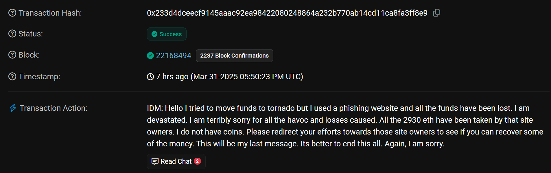 留言内容如下:“你好,我试图通过 Tornado转移资金,但不慎使用了一个钓鱼网站,导致所有资金损失。我感到非常痛心。对造成的所有混乱和损失,我深表歉意。全部 2,930 个 ETH 都被那个网站的所有者盗取。我已经没有任何代币了。请将精力转向那些网站所有者,看看是否能追回一些资金。这将是我的最后一条消息。结束这一切可能更好。再次向您致歉。”