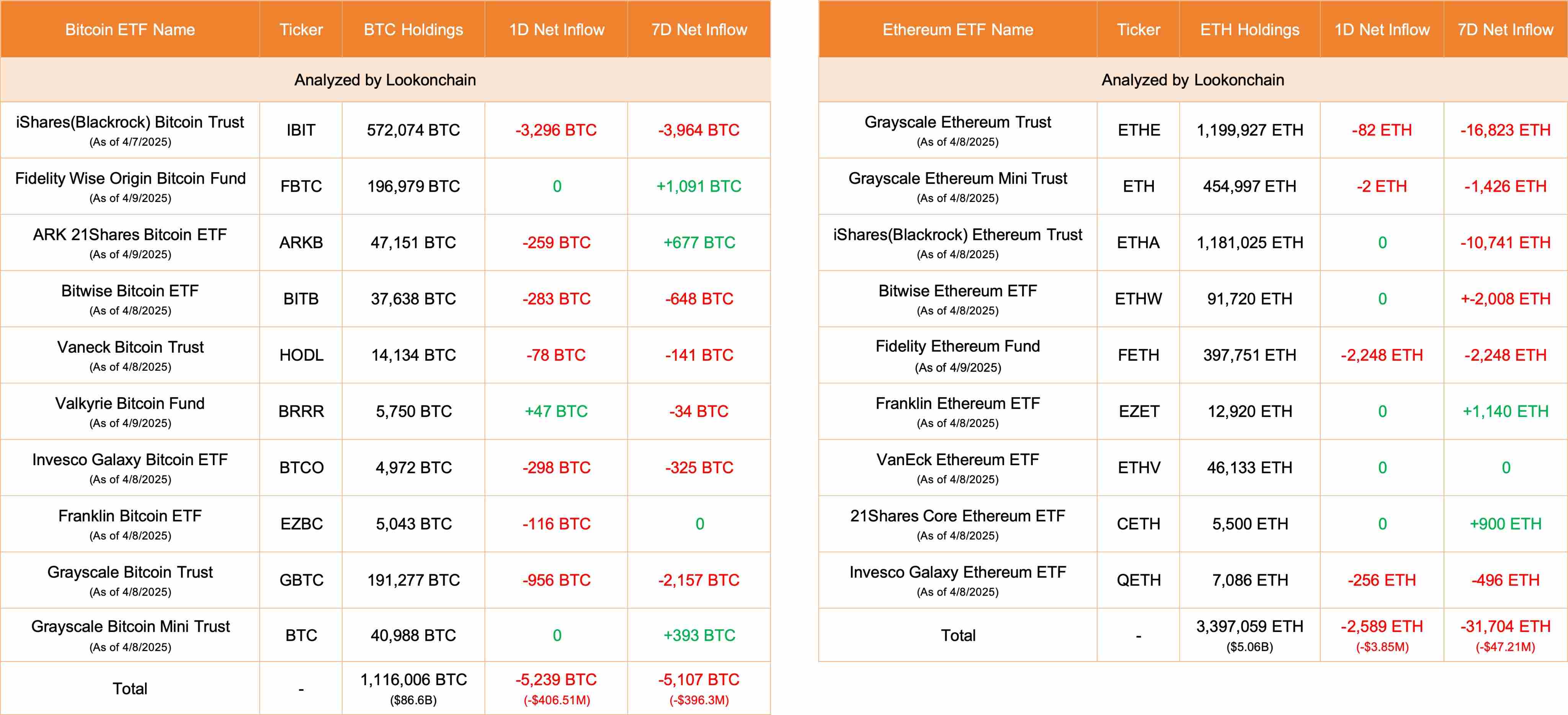 深潮 TechFlow 消息,4 月 9 日,据 Lookonchain 监测,截止于发稿,今日 10 只美国比特币 ETF 净流出 5239 枚 BTC,9 只以太坊ETF净流出 2589 枚 ETH。