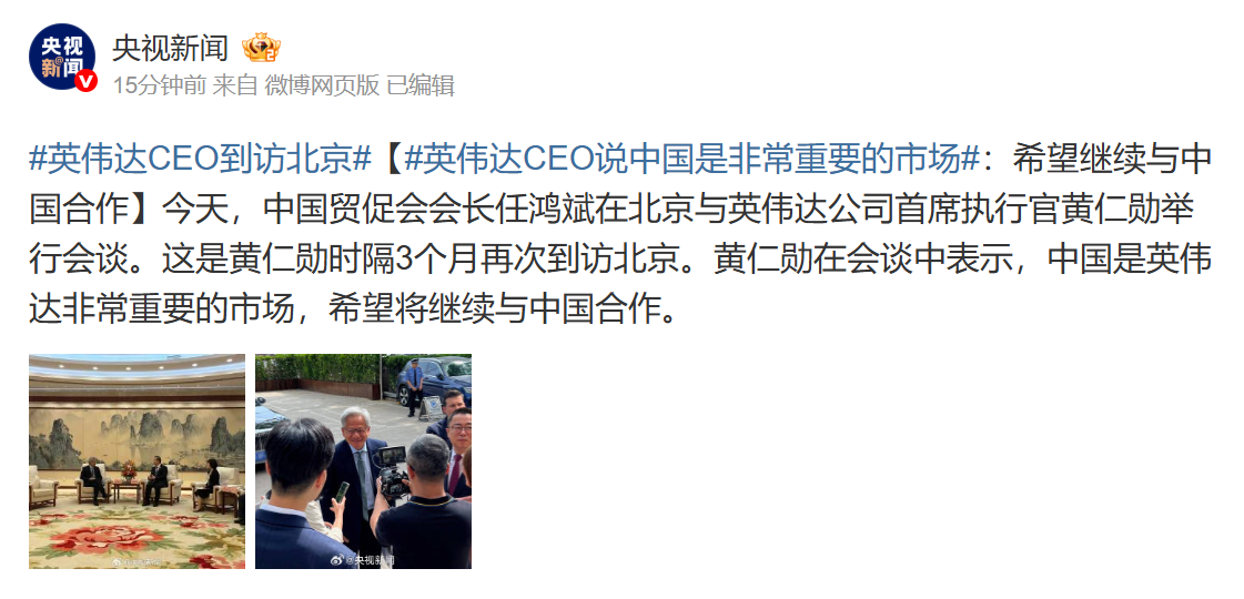 深潮 TechFlow 消息,4 月 17 日,据央视新闻报道,今日中国贸促会会长任鸿斌在北京与英伟达首席执行官黄仁勋举行会谈,这是黄仁勋时隔 3 个月再次到访北京。黄仁勋在会谈中表示,中国是英伟达非常重要的市场,希望将来继续与中国合作。