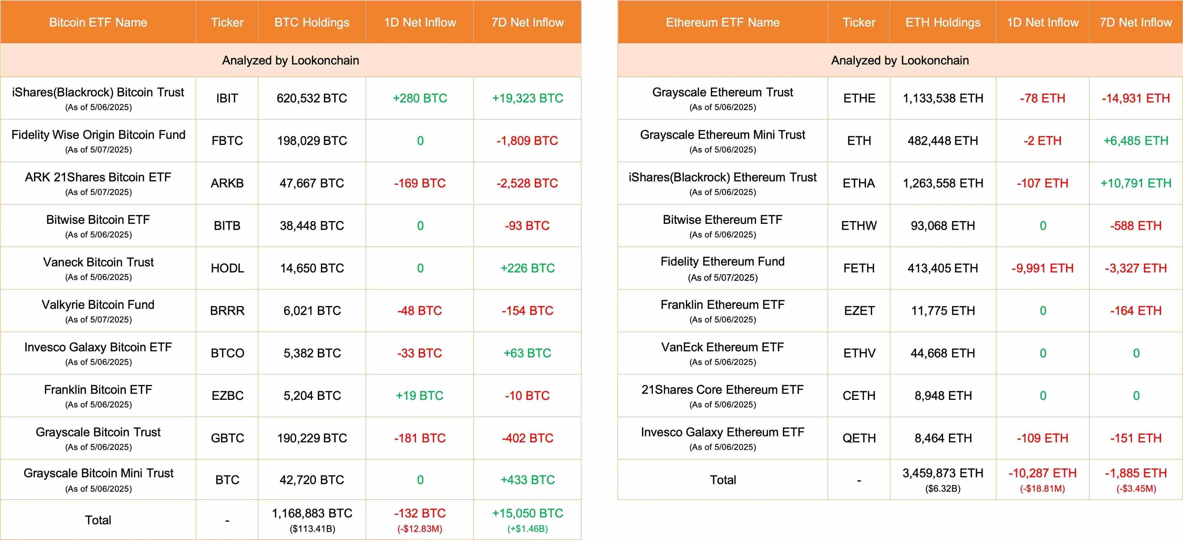 深潮 TechFlow 消息,5 月 6 日,据 Lookonchain 监测,截止于发稿,今日 10 只美国比特币 ETF净流出 132 枚 BTC(约 1283 万美元)。9 只以太坊现货 ETF 净流出 10287 枚 ETH(约 1881 万美元)。