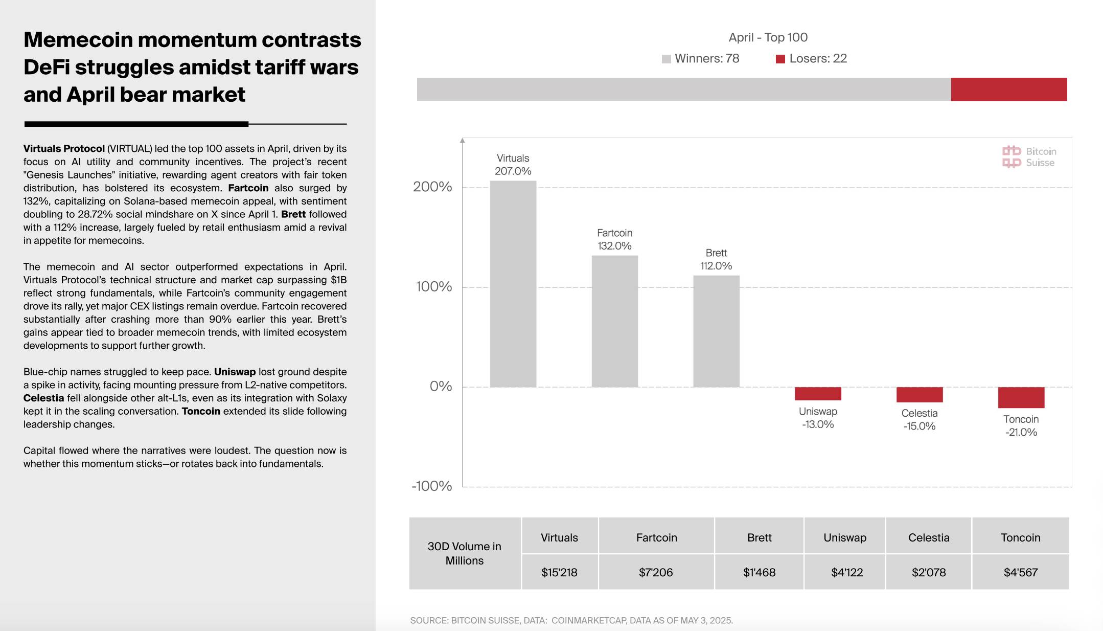 深潮 TechFlow 消息,5 月 8 日,据Bitcoin Suisse数据显示,2025年4月加密资产市场呈现板块分化特征。AI项目Virtuals Protocol价格上涨207%,成为当月表现最显著的资产之一,其市值规模超过10亿美元;Solana生态系统中的Fartcoin与Brett分别取得132%和112%的价格上涨。DeFi和基建板块,Uniswap、Celestia和Toncoin分别录得-13%、-15%和-21%的价格下跌。数据显示,在前100位加密资产中,78个资产价格上行,22个资产价格下行。从交易规模来看,Virtuals和Fartcoin的30日交易量分别为152.18亿和72.06亿美元。