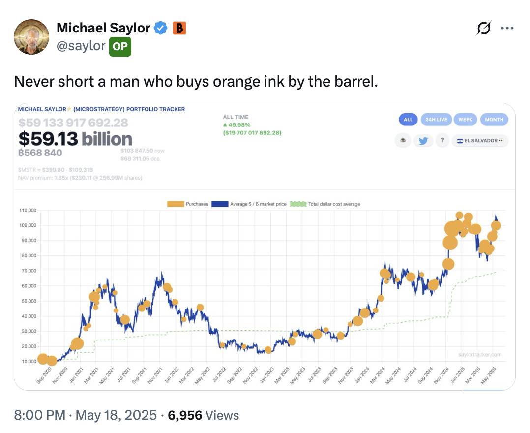 深潮 TechFlow 消息,5 月 18 日,Strategy 创始人 Michael Saylor 再次发布比特币 Tracker 相关信息,他表示:「永远不要亏待那些成桶购买橙色墨水的人」。