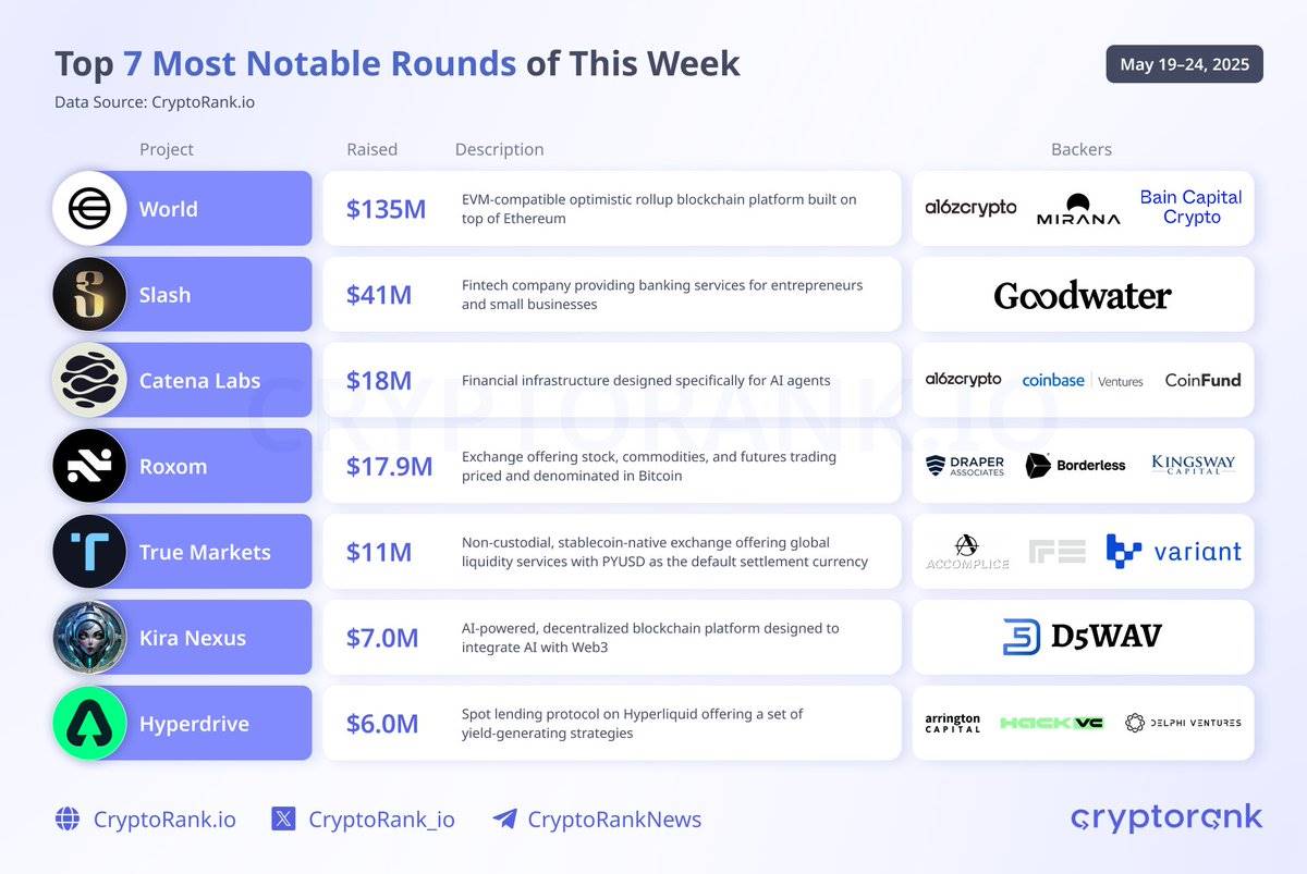 深潮 TechFlow 消息,5 月 25 日,据 Fundraising Digest 发布的融资信息显示,本周共有 7 笔大额融资,最大融资金额为 Worldcoin 1.35 亿美元。详细信息: