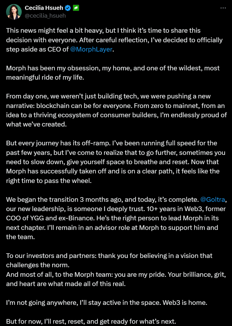 Morph 联创 Cecilia Hsueh 宣布卸任 CEO 职位,由币安前高管 Colin Goltra 接任