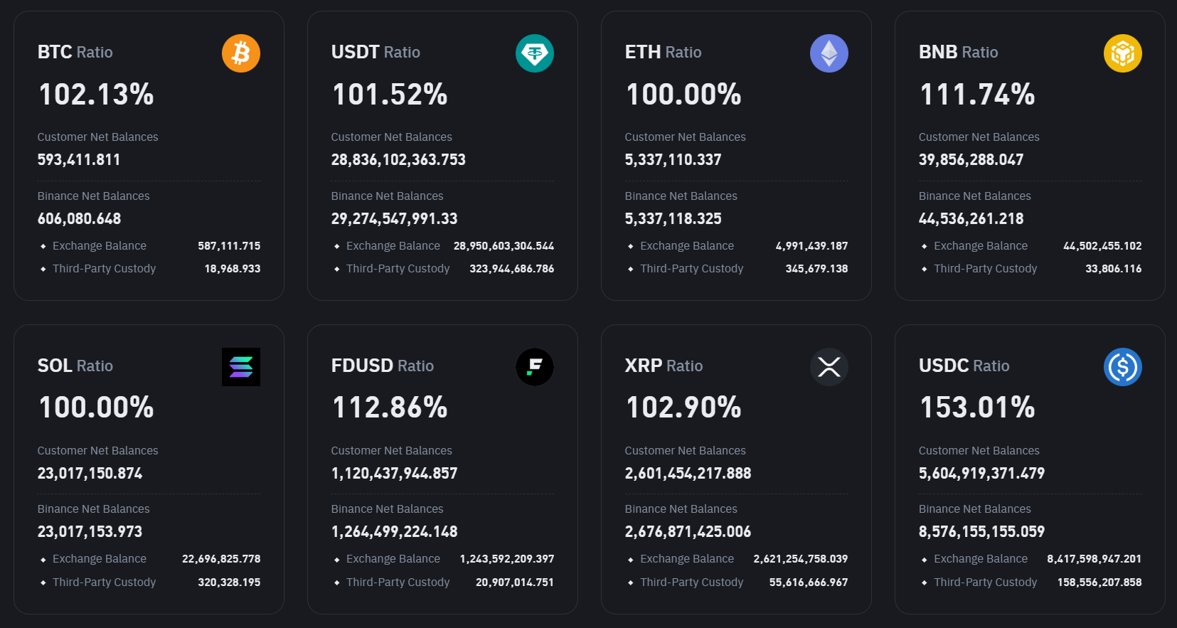 深潮 TechFlow 消息,6 月 9 日,币安最新储备金证明(PoR)报告显示,币安主要资产储备率均超100%。其中BTC储备率为102.13%,持有606,080.648枚比特币;USDT储备率为101.52%,持有约292.7亿枚;ETH储备率为100.00%,持有约533.7万枚;BNB储备率为111.74%,持有约4453.6万枚。USDC储备率最高,达153.01%,显示充足的资金储备。