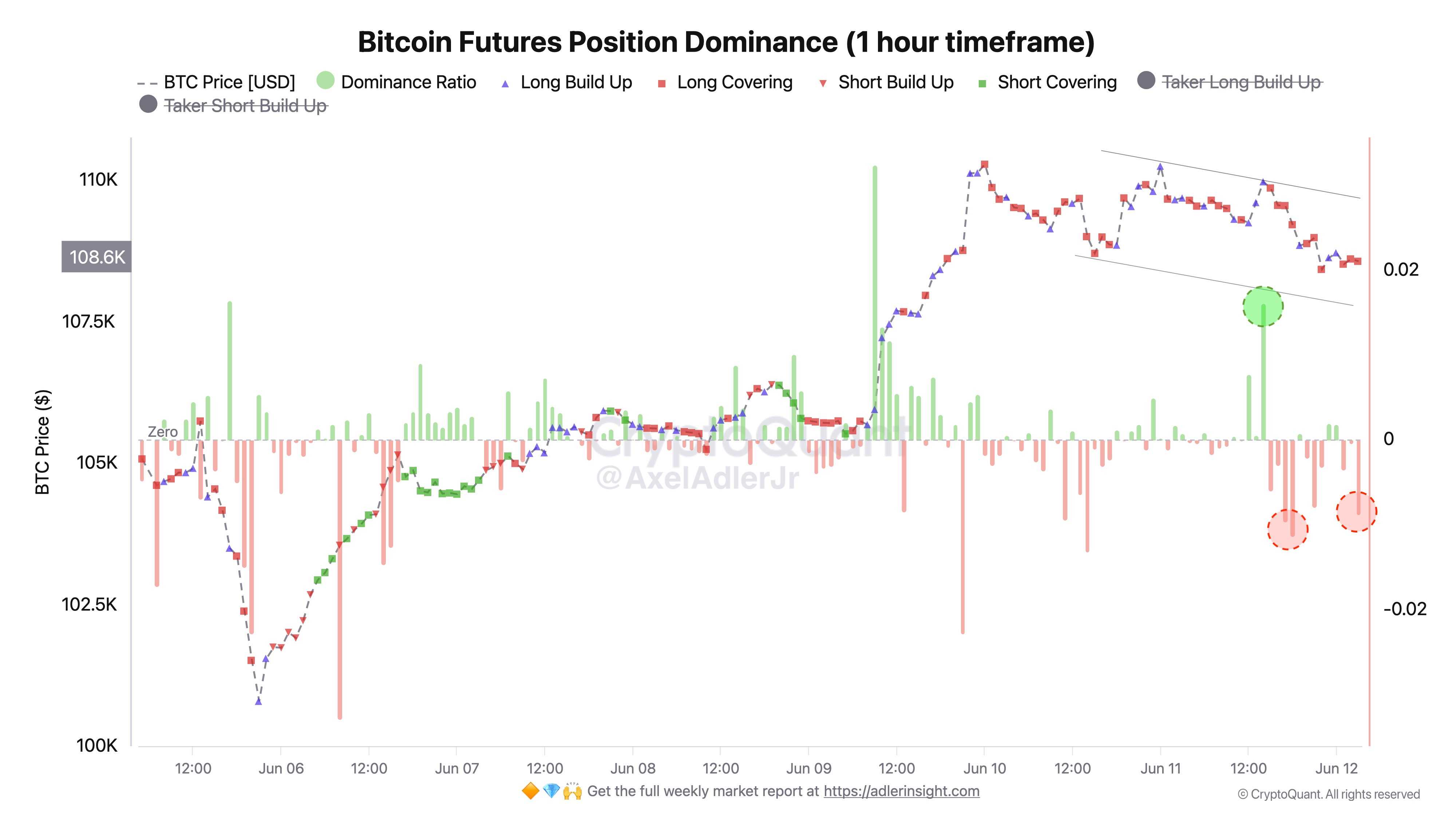 深潮 TechFlow 消息,6 月 12 日,据 CryptoQuant 分析师 Axel Adler Jr 披露,当前 1 小时内出现明显的多头平仓与积极的空头交易量。这是上涨趋势后的典型"软反转点":资金费率保持正值但未平仓合约数量下降,预计将出现短期调整或在 10.8 万美元以下盘整。