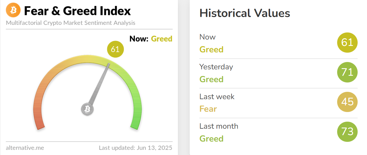 深潮 TechFlow 消息,6 月 13 日,据 Alternative.me 数据,今日加密货币恐慌与贪婪指数降至 61(昨日该指数为 71),表明市场仍处于「贪婪状态」。