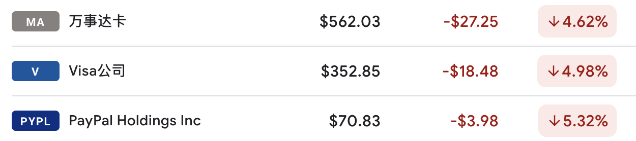 或受「沃尔玛与亚马逊探索稳定币」消息影响,Visa、Mastercard、Paypal 股价均下跌约 5%