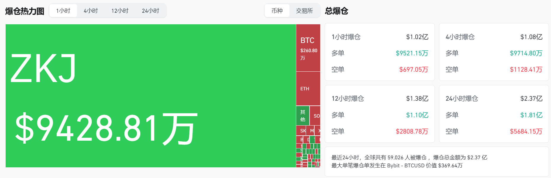过去 1 小时全网爆仓 1.02 亿美元,其中 ZKJ 爆仓 9428.81 万美元。