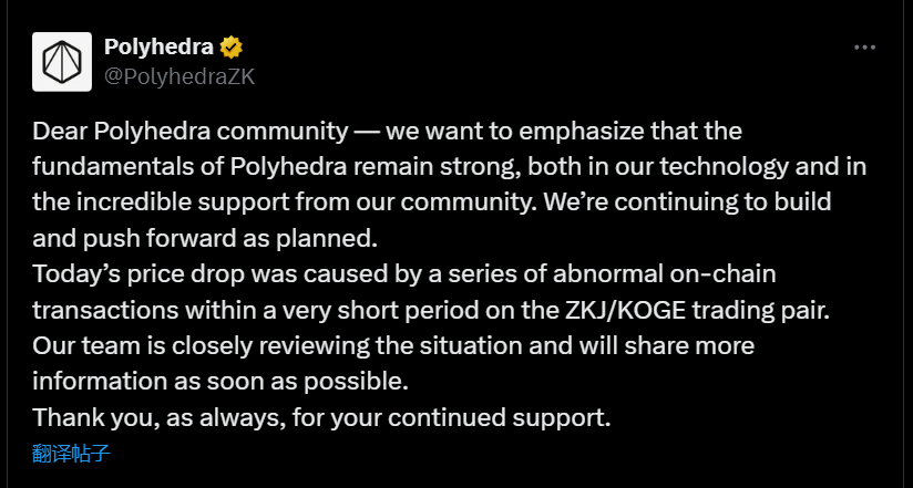 Polyhedra:ZKJ/KOGE 今日短时出现异常链上交易,Polyhedra 的基本盘没有受到影响