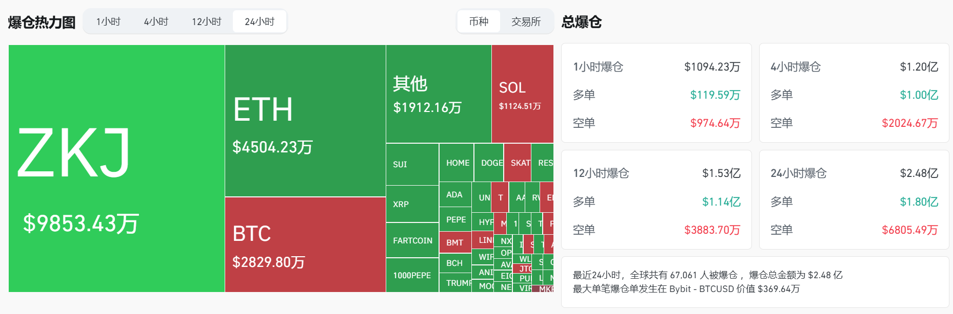 ZKJ 爆仓 9853.43 万美元,BTC 爆仓金额达 2829.80 万美元,ETH 爆仓 4504.23 万美元。过去 24 小时内共有 67,061 人被爆仓,最大单笔爆仓出现在 Bybit 的 BTC-USD 交易对上,价值 369.64 万美元。