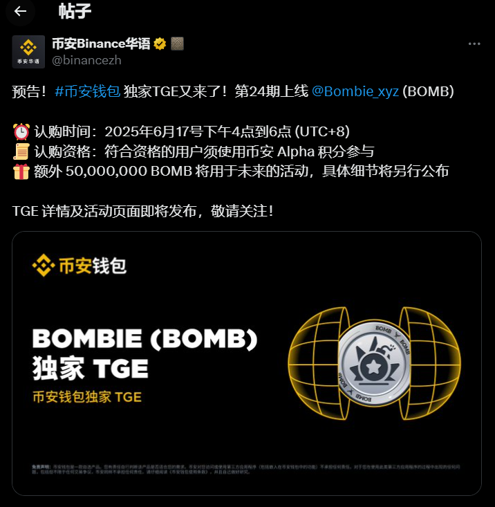 深潮 TechFlow 消息,6 月 16 日,据官方公告,币安钱包将上线新一期 TGE BOMB,认购时间为 2025 年 6 月 17 号下午 4 点到 6 点 (UTC+8)。