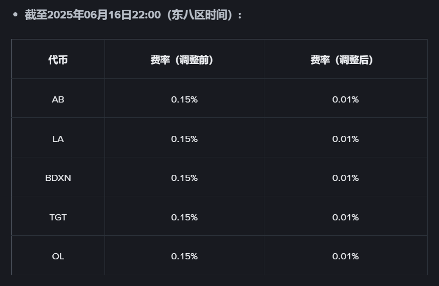 深潮 TechFlow 消息,6 月 16 日,据官方公告,币安 Alpha 将把 AB、LA、BDXN、TGT、OL 代币的交易对手续费费率由0.15%调整为0.01%