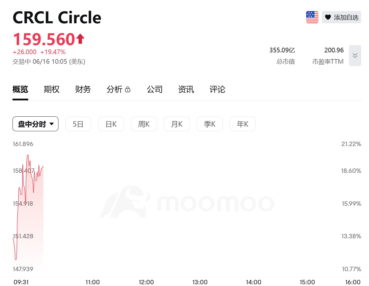 Circle 短时突破160 美元,续创历史新高,日内涨幅约 20%