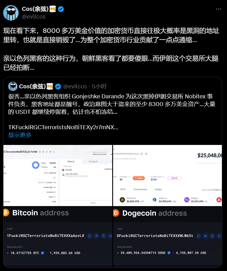 深潮 TechFlow 消息,6 月 18 日,慢雾余弦在社交媒体发文表示,“现在看下来,8000 多万美金价值的加密货币直接往极大概率是黑洞的地址里转,也就是直接销毁了…为整个加密货币行业贡献了一点点通缩,亲以色列黑客的这种行为,朝鲜黑客看了都要傻眼…而伊朗这个交易所大腿已经拍断。”