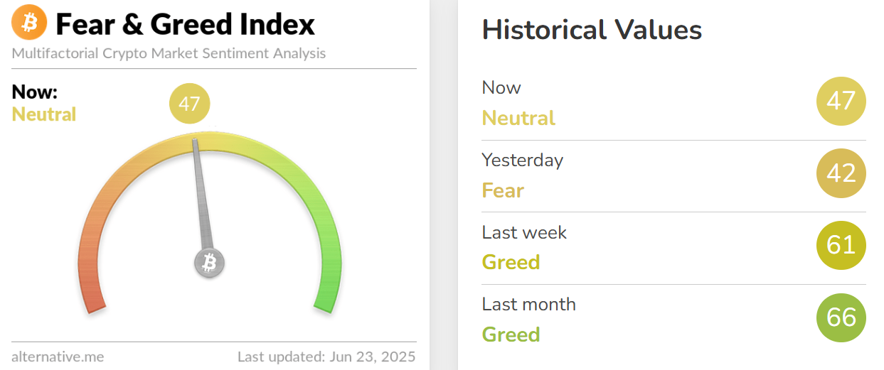 深潮 TechFlow 消息,6月23日,据 Alternative.me 数据,今日加密货币恐慌与贪婪指数升至 47(昨日该指数为 42),表明市场已转为「中性状态」。
