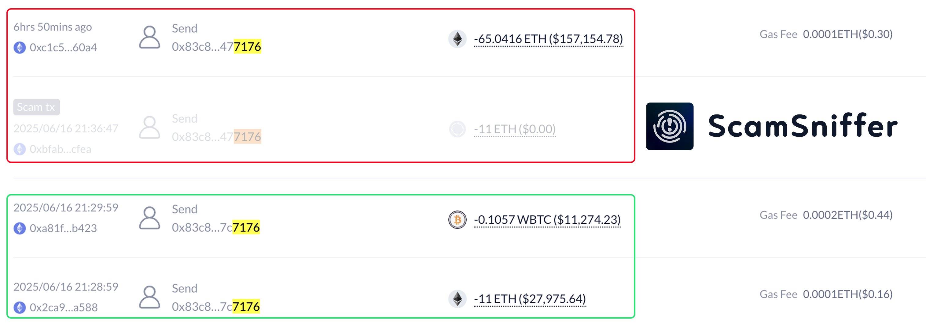 深潮 TechFlow 消息,6 月 26 日,据 Scam Sniffer 监测,某用户遭“交易历史投毒攻击”,受害者在转账过程中误将资金发送至诈骗者地址,损失约 157,154 美元的加密货币。