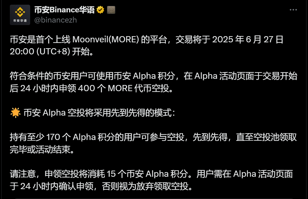 币安:Moonveil(MORE) 空投的申领门槛为170 Alpha 积分
