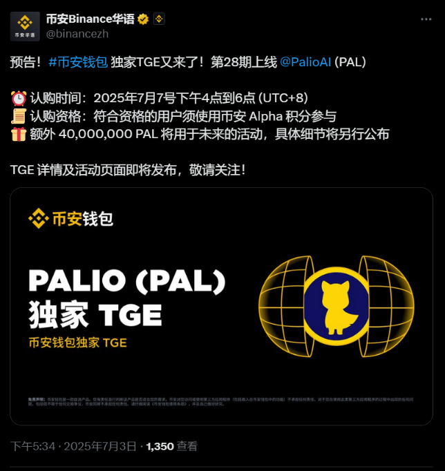 深潮 TechFlow 消息,7 月 3 日,据官方公告,币安钱包将于 2025 年 7 月 7 日下午 4 点到 6 点独家上线 Palio AI (PAL) 代币 TGE。符合资格的用户需使用币安 Alpha 积分参与认购。此外,4000 万枚 PAL 代币将用于未来活动,具体详情将另行公布。