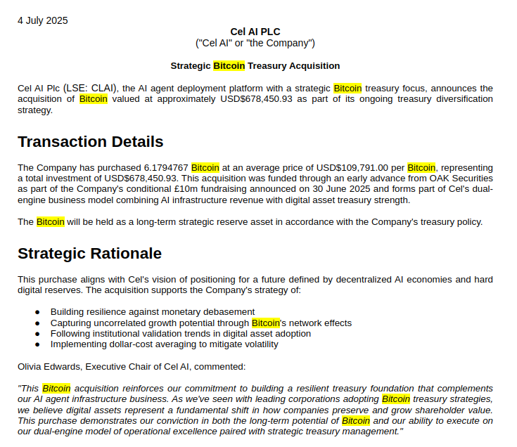 深潮 TechFlow 消息,7 月 4 日,据官方公告,英国上市公司Cel AI 以每枚比特币109,791.00美元的平均价格购入了6.1794767枚比特币,总投资额为678,450.93美元。