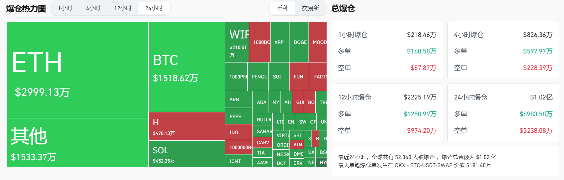 BTC 爆仓金额达 1518.62 万美元,ETH 爆仓 2999.13 万美元,SOL 爆仓 452.25 万美元。过去 24 小时内共有 52,360 人被爆仓,最大单笔爆仓出现在 OKX 的 BTC-USDT-SWAP 交易对上,价值 181.40 万美元。