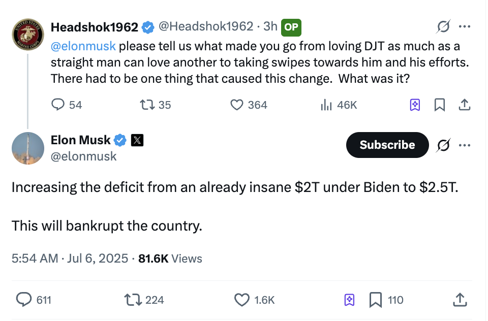 深潮 TechFlow 消息,7 月 6 日,在马斯克宣布成立“美国党”之后,有用户在 X 平台发文向马斯克提问:“是什么让你从极致爱特朗普到现在开始批评他和他的努力。是什么原因导致了这种转变呢?”马斯克回复道:“赤字将从拜登执政时期已经疯狂的 2 万亿美元增加到 2.5 万亿美元。这会使国家破产。”